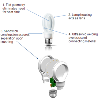 - The polycarbonate parts are connected by ultrasonic welding such that the connection is strong enough in normal use, but breaks apart when shredded. The other parts of the lamp are then also liberated.1