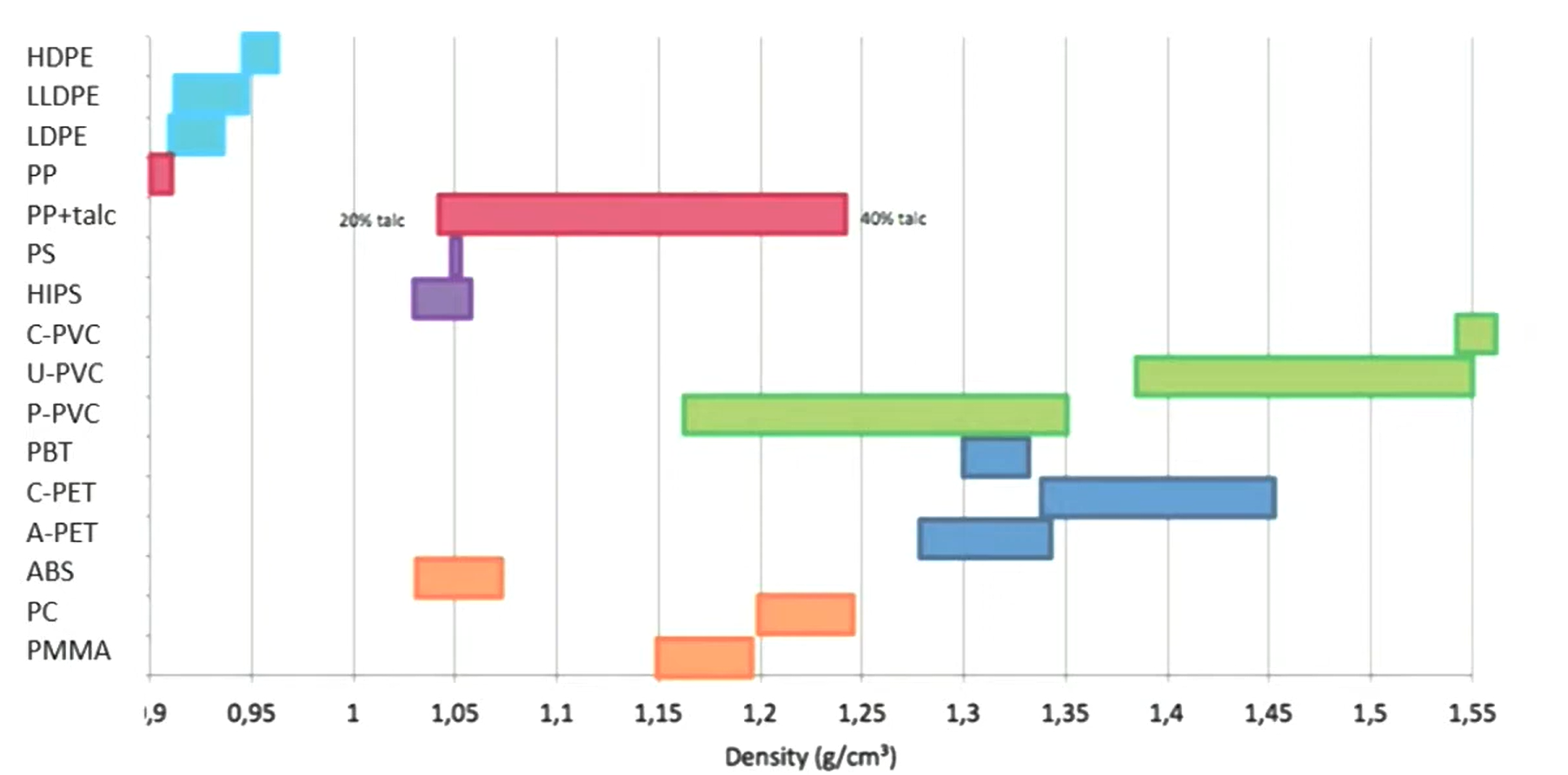 For example, PET becomes brittle and yellow when it is blended with a small concentration of PVC, which both have a density of about 1.4 g/cm3